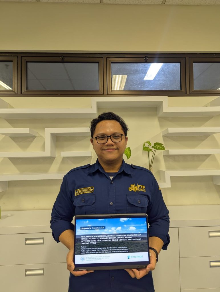 This year’s STPI attracted 226 presenters from various universities across Indonesia, reflecting a strong enthusiasm for research-based agricultural technology development. Among them were two student researchers from the Smart Agriculture Research Center, DTPB FTP UGM — Fahmi Arsyad and Mutiara Alifia Ramadhanty — who presented their research on developing a system to determine papaya tree health using Vertical Take-Off and Landing (VTOL) drones equipped with RGB and multispectral cameras. This research was supported by the Inter-University Center of Excellence (PUAPT) program at Universitas Gadjah Mada.