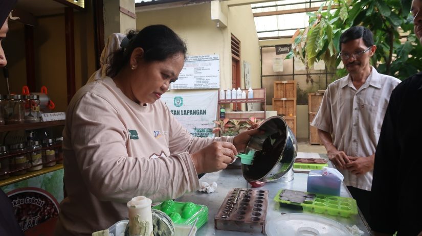 Pelatihan kali ini difokuskan pada pembuatan cokelat praline, yakni camilan cokelat berisian yang biasanya terbuat dari kacang-kacangan, buah kering, karamel, atau krim. Praline dipilih karena memiliki nilai jual tinggi, populer sebagai camilan premium maupun hadiah istimewa, serta berpotensi membuka peluang diversifikasi produk bagi Taman Kakao.