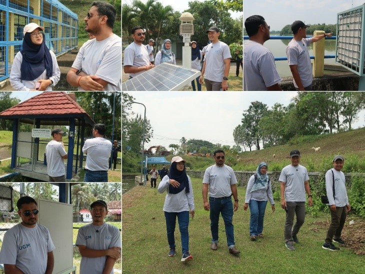 Kunjungan diawali di Bendung Sapon untuk meninjau implementasi modernisasi irigasi di Daerah Irigasi Sapon. Sistem irigasi ini telah menggunakan pintu pengambilan berbasis motor listrik serta Automatic Water Level Monitoring System (AWLMS) yang dikembangkan oleh tim SIPASI UGM (Sistem Pengelolaan Irigasi). AWLMS terintegrasi dengan decision support system sehingga memungkinkan pemantauan ketinggian muka air secara efisien, sekaligus menyediakan kemampuan prediksi dengan membandingkan data terkini dan data historis. Teknologi ini memberikan insight penting bagi pengambil kebijakan dalam merencanakan kebutuhan air di daerah irigasi secara lebih tepat dan berkelanjutan. Selain itu, tim juga meninjau lokasi percontohan penerapan sistem ini pada pintu air yang mampu menyesuaikan volume distribusi air sesuai kebutuhan lahan pertanian.