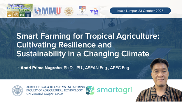 Yogyakarta, 23 Oktober 2025 – Dr. Andri Prima Nugroho, Kepala Laboratorium Energi dan Mesin Pertanian, Departemen Teknik Pertanian dan Biosistem, Fakultas Teknologi Pertanian, Universitas Gadjah Mada (UGM), berpartisipasi sebagai narasumber dalam International Sustainability Webinar yang diselenggarakan oleh Multimedia University (MMU) Sustainability Development Committee, Malaysia. Webinar daring ini mengangkat tema krusial “Harnessing Technology for Climate-Resilient Agriculture” atau “Memanfaatkan Teknologi untuk Pertanian Tangguh Iklim”, dan berlangsung pada Kamis, 23 Oktober 2025, pukul 10.00-12.00 waktu Malaysia (09.00-12.00 WIB) melalui platform Microsoft Teams.