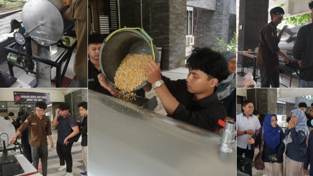 Kelompok RODEOGAMA memamerkan rotary dryer dengan optimasi suhu dan laju alir udara yang dirancang untuk meningkatkan efisiensi pengeringan hasil panen jagung. Alat ini diharapkan mampu mendukung pascapanen jagung secara lebih efektif dan berkelanjutan.