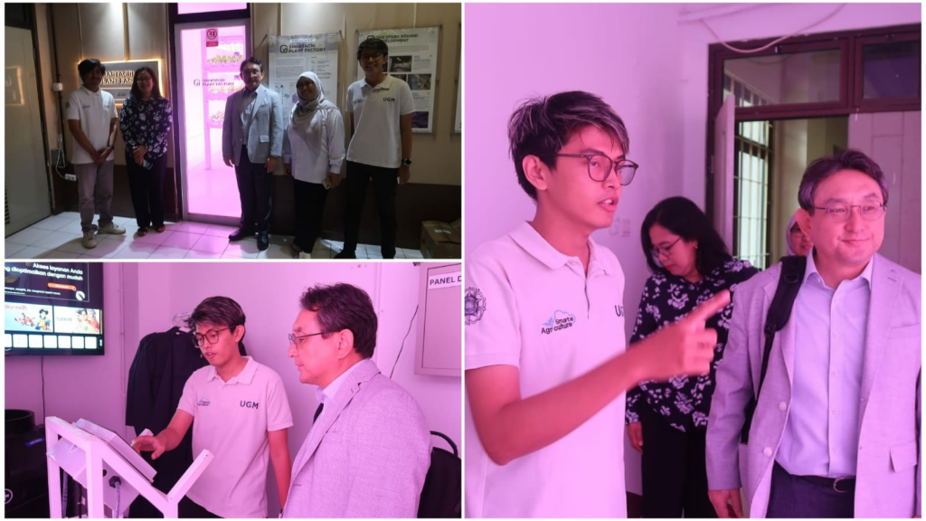 Selanjutnya, Prof. Cho mengunjungi Smart Agri Plant Factory untuk melihat fasilitas plant factory sebagai sarana pembelajaran dan riset berbasis pertanian modern. Fasilitas ini dijelaskan oleh mahasiswa program magister, Athalla Fawwaz, yang memaparkan peran plant factory dalam mendukung produksi pertanian yang efisien dan berkelanjutan.