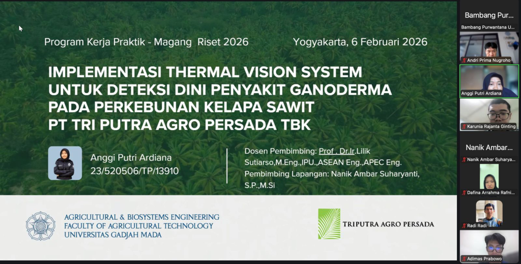 Yogyakarta, 6 Februari 2026 – Empat mahasiswa Program Studi Teknik Pertanian dengan Kebidangan Teknik Mesin dan Biosistem (TMB) Fakultas Teknologi Pertanian (FTP) UGM sukses mempresentasikan kemajuan riset mereka dalam program Magang Riset di PT. Triputra Agro Persada. Kegiatan ini merupakan bagian dari kegiatan Magang Riset Industri yang bertujuan untuk mengimplementasikan pertanian presisi pada perkebunan kelapa sawit.